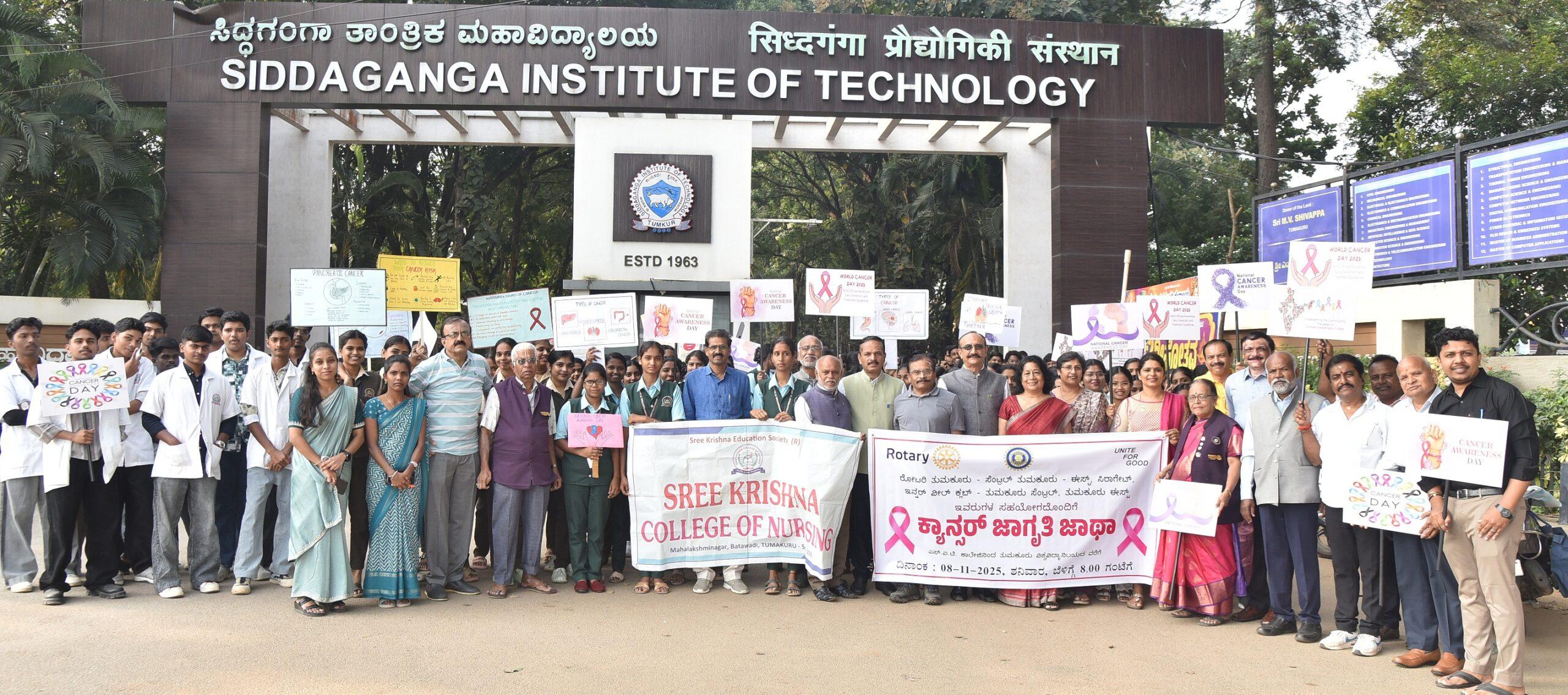 ನಗರದ ಎಸ್ಐಟಿ ಕಾಲೇಜು ಮುಂಭಾಗದಿAದ ಆರಂಭವಾದ ಕ್ಯಾನ್ಸರ್ ಜಾಗೃತಿ ಜಾಥಾವು ಬಿ.ಹೆಚ್. ರಸ್ತೆ ಮೂಲಕ ಸಾಗಿ ತುಮಕೂರು ವಿಶ್ವವಿದ್ಯಾನಿಲಯದ ಮುಂಭಾಗ ಮುಕ್ತಾಯಗೊಂಡಿತು. ಈ ಜಾಗೃತಿ ಜಾಥ ಸಾಗಿದ ಮಾರ್ಗದುದ್ದಕ್ಕೂ ನರ್ಸಿಂಗ್ ಕಾಲೇಜು ವಿದ್ಯಾರ್ಥಿಗಳು ಕ್ಯಾನ್ಸರ್ ಕುರಿತು ಜನರಲ್ಲಿ ಜಾಗೃತಿ ಮೂಡಿಸಿದರು.