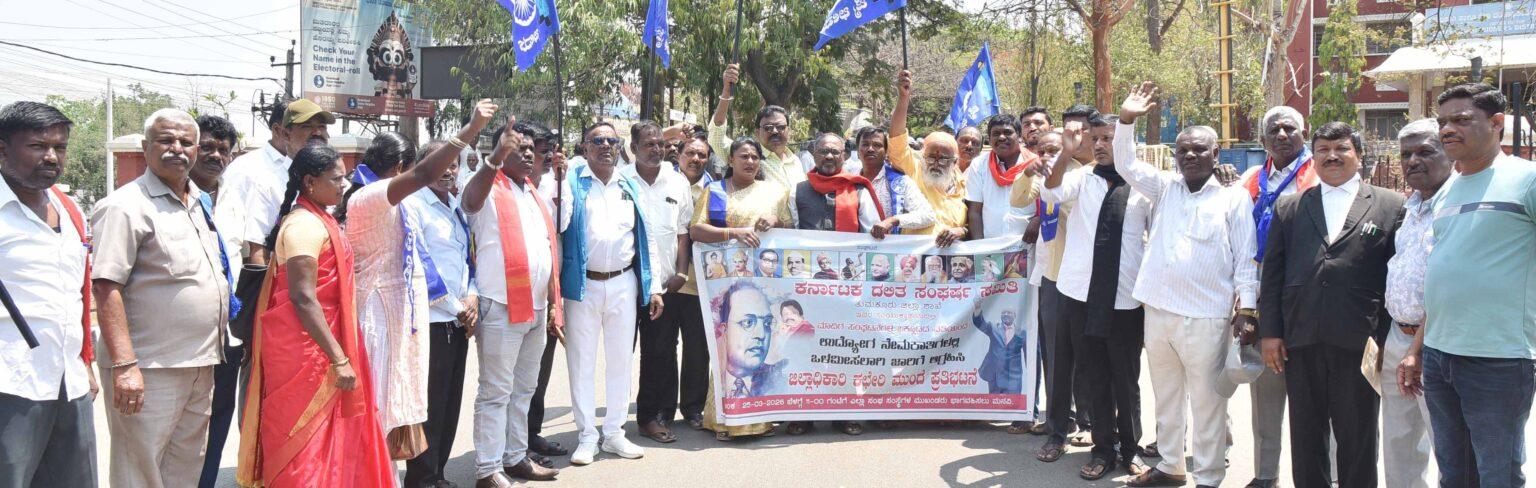 ಈ ವೇಳೆ ಮಾತನಾಡಿದ ಡಿಎಸ್ಎಸ್ ಡಾ.ಎನ್.ಮೂರ್ತಿ ಬಣದ ಜಿಲ್ಲಾಧ್ಯಕ್ಷ ಪಿ.ಎನ್.ರಾಮಯ್ಯ, ಕರ್ನಾಟಕ ರಾಜ್ಯ ಸರಕಾರ ಸುಪ್ರೀಕೋರ್ಟಿನ ತೀರ್ಪಿನ ಅನ್ವಯ ನಿ.ನ್ಯಾಯ ಮೂರ್ತಿ ನಾಗ ಮೋಹನ್ದಾಸ್ ಆಯೋಗ ರಚಿಸಿ ವರದಿ ಪಡೆದು. ತಾರೀಖು : ೨೫/೦೫/೨೦೨೫ ರಂದು ಸಚಿವ ಸಂಪುಟ ವರದಿಯನ್ನು ಅಂಗೀಕರಿಸಿತು. ಆ ನಂತರ ವಿಧಾನ ಸಭೆ ಹಾಗೂ ವಿಧಾನ ಪರಿಷತ್ ಪರಿಶಿಷ್ಟರ ಉಪ ವಗೀಕರಣ ಮಸೂದೆ ೨೦೨೬ ನ್ನು ಅಂಗೀಕರಿಸಿ ರಾಜ್ಯಪಾಲರಅಂಕಿತ ಪಡೆದು ಮಸೂದೆಅಧಿಕೃತವಾಯಿತು.ಆದರೆರಾಜ್ಯ ಸರ್ಕಾರಎಲ್ಲಾವನ್ನು ಕಡೆಗಣಿಸಿ ಒಳಮೀಸಲಾತಿ ಇಲ್ಲದೆ ೫೬೪೩೨ ಉದ್ಯೋಗ ನೇಮಕಾತಿ ಮಾಡಲು “ಸಚಿವ ಸಂಪುಟ” ದ ತೀರ್ಮಾನದಂತೆ, ತಾರೀಖು ೨೭/೦೨/೨೦೨೬ ರಂದು ಸುತ್ತೋಲೆ ಹೊರಡಿಸಿದೆ. ಈ ಸುತ್ತೋಲೆಯಂತೆಉದ್ಯೋಗ ನೇಮಕಾತಿ ನಡೆದರೆ ಮಾದಿಗ ಮತ್ತು ಸಂಬ0ಧಿತ ಉಪಜಾತಿಗಳಿಗೆ ಜನ ಸಂಖ್ಯೆ ಅನುಗುಣವಾಗಿ ಉದ್ಯೋಗ ದೊರಕದೆ ಅನ್ಯಾಯವಾಗುತ್ತದೆ ಎಂದರು.